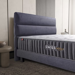 Le lit Aura associe avec raffinement un tapissier de lit de 15 cm au design épuré et le matelas Swiss Hôtel 26 Moyen ou Ferme, offrant un soutien équilibré et durable.